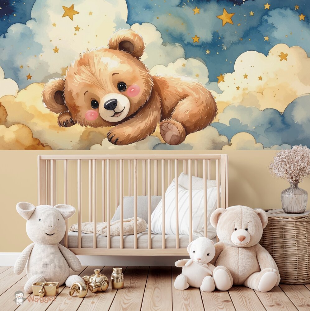 Creëer een dromerige babykamer met dit schattige beertjes behang uit het Happy Tails thema. Zachte pastelkleuren en lieve details zorgen voor een warme, rustgevende sfeer.